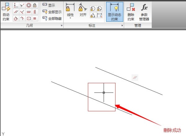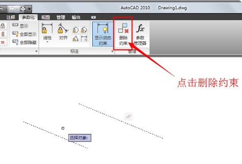 4、我们想让这两条直线垂直,我们就要先删除平行约束,点击参数化→删除约束;选择对象,回车