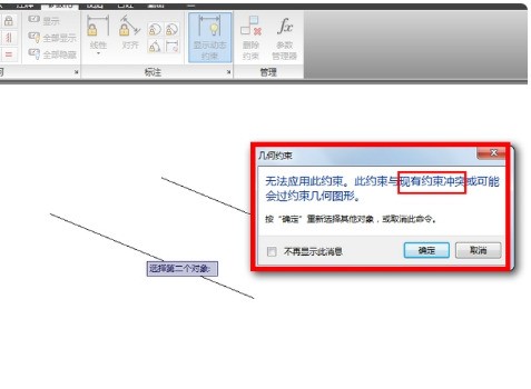 3、当选择垂直:约束两条直线来自或者多段线段,使其夹角始终保持为92度。此时会出现如图所示的对话窗,无法应用此约束