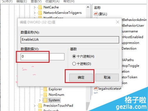 3、找到EnableLUA后双击打开,在EnableLUA属性窗口中将“数值数据”修改为“0”然后点击“确定”,最后关闭注册表,最后重启电脑生效。如图3所示
