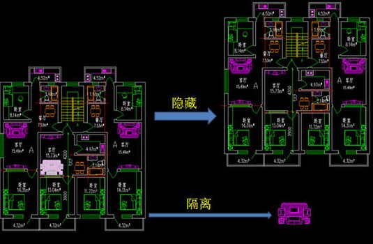 此功能可以让用户直接隔离、隐藏选定对象,不用考虑对象所处图层,在有些情况下比操作图层更方便快捷。