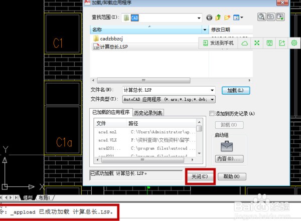 4、底下命令栏就会提示”加载成功“,我们就可以把界面中的对话框点击”关闭“;
