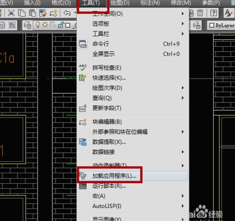 2、打开要测长度所对应的cad图纸,点来自击”工具“---”加载应用程序“;