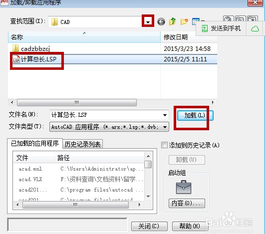 3、在弹出的对话框中,利用小三角找到下载好的”计算总长“的插件,选择好,点击中间的”加载“;