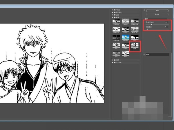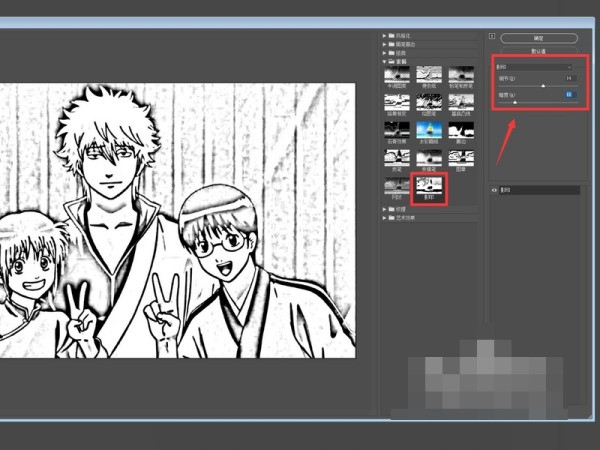 4、我们点来自击素描效果内的图章,点击后我们就会发现图片已经初步形成线稿效果,然后点击箭头所指的红框处进行细部调整就可以。