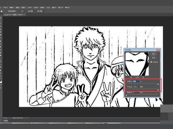 6、最后一步,我们需要对线稿进行锐化处理,打开USM锐化窗口,一般根据图片实际效果进行调整,只要人物的线稿,背景什么的都不需要的话,我们把数量和半径选区调到最大,这样清晰的线稿图就制作好啦。