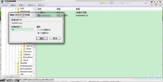 4.双击“UndoHistory”,打开“编辑DWORD值”对话框,单击“十进制”,然后在“数值数据”框中键入一个你希望Excel能够撤消次数的数值,比如可以键入“50”,单击“确定”按钮。