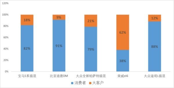 从以上数据可以看出,除了荣威ei6以外,其他车型主要由终端消费者购买,比亚迪唐DM的终端消费者购买占比达91%。那么剔除大客户购买数据之后,以上这5款车还是不是终端消费者购买最伤皇究器多的车型呢,请大家看以下数据。