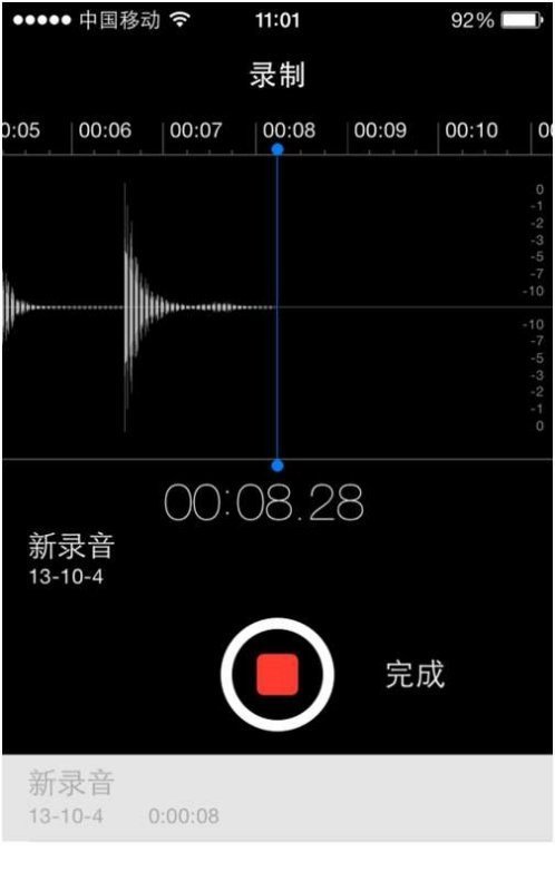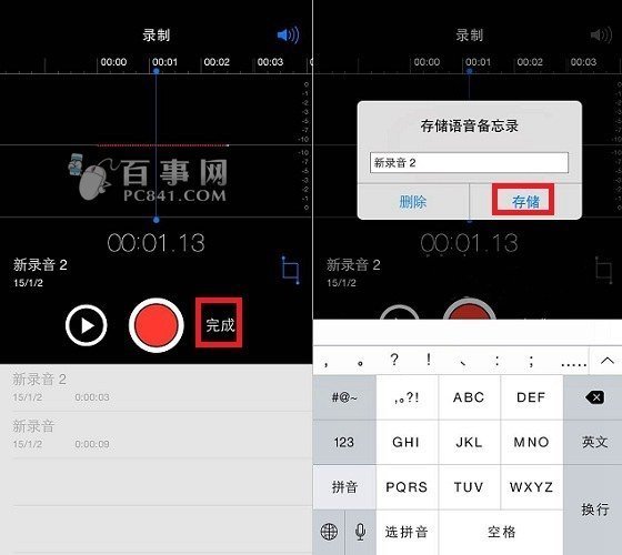 6、在暂停状态下,点击小红圈后面的【完成】就可以保存iPhone6的录音,并且还可以为这段录音命名,完成后,点击【存储】即可完成保存。