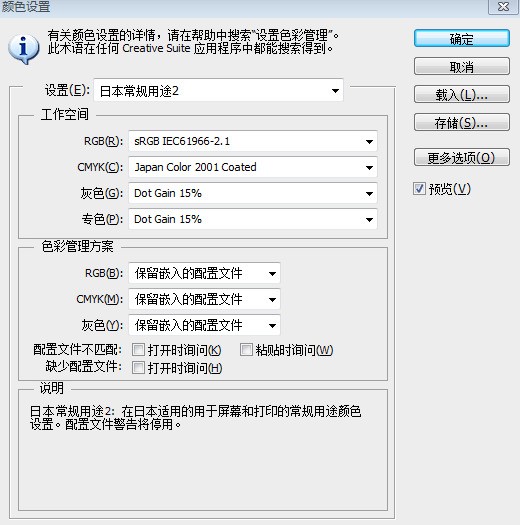 针对上图讲一下,色彩管理方案中下面有四个询问复选框,可以打勾.