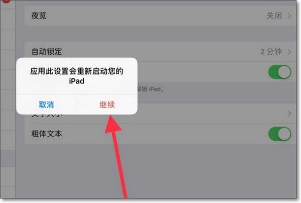 6、紧接着就会弹出一个应用此设置会重新启动您的ipad的对话框,我们点击继续,ipad重启之后,网页字体大小就会加粗了。
