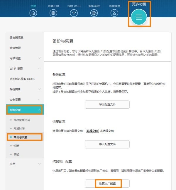 2、点击更多功能 > 系统设置 > 备份与恢复。点击恢复出厂配置。