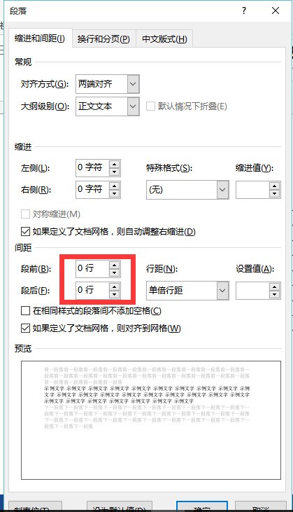 2、在行距选项设置界面,将中间的“间距”栏的行前及行后的值设置成所需的行间距即可(如图2所示)。