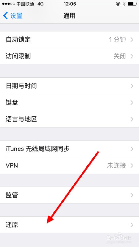 第三步:打开设置/通用/还原/还原网络设置。设备自动重启。
