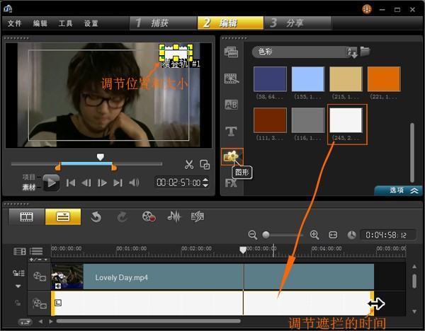 选择“图形”,将某一样式拖曳至覆叠轨,如下图所示。调整长度(播放时间),还有在左上方的预览窗口中,可以调节覆叠轨图片的大小和位置。