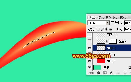 4、新建一个图层,用钢笔勾出中间高光部分选区,羽化4个像素后填充橙黄色。