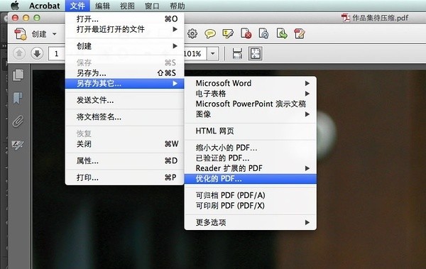 2. 第二步,如下图,用Acrobat 打开作品集的PDF文件,选择“文件”—>“另存为其他”—> “优化的PDF”。