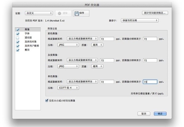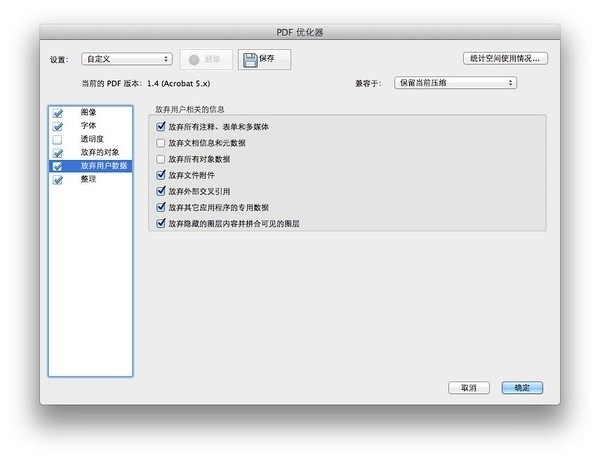 4. 第四步,为了减小尺寸,所以为了网申提交而优化的PDF作品集文档不需要太多无用数据,只需移底提要按照下图设置好“放弃的对象” “放弃用户数据”以及 “整理”。