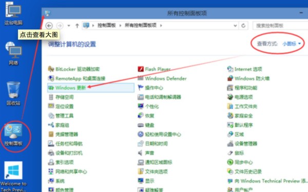 1。双击Win10系统桌面上的控制面板,在查看方式为小图标,找到Win10更新点击Windows 更新进入
