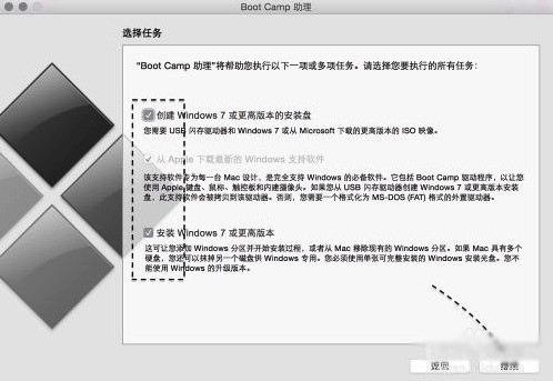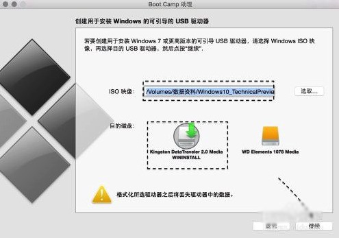 3、随后请选中制作启动 U 盘的所有选项,然后点击“继续”按钮。更新:现在 2015 年后的新的 Mac 电脑已经不需要使用 U 盘来安装 Wi越岩字没增而其王需会参n10 作双系统了,现在可以直接使用 bootcamp 选择已经下载好的纯净的 64 位 Win10 镜像进行一键安装系统,Win10 的 bootcamp 驱动也会一并下载好。安装好 Win10 之后,在 Win10 里面有 2 个硬盘, Mac 的 bootcamp 驱动直接在那个 8G 的硬盘里面找到安装即可,重启后这个盘就会消失。