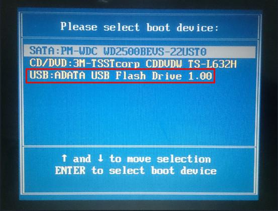 1、把制作好的U极速U盘插入要重装系统的电脑并重启电脑,当屏幕显示电脑品牌的LOGO时按下启动项快捷键(自己根据主板品牌对照下图),进入启动项选择窗口,借助方向键选择USB开头的U盘启动项(如图),按下回车键确认。