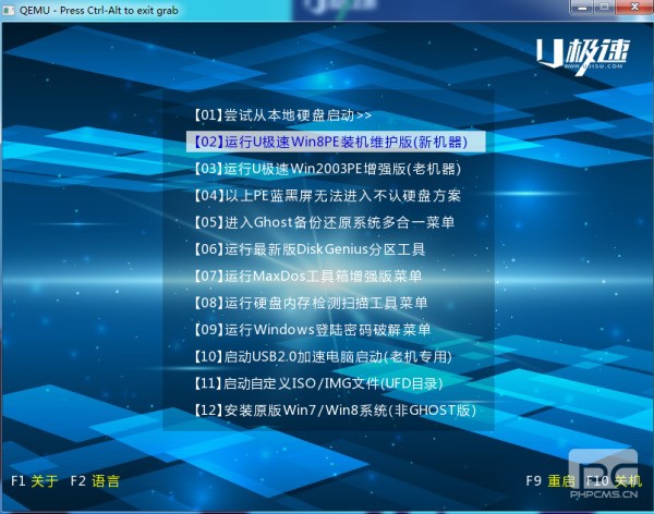 2、进入U极速win PE主菜单后,选择【02】运行U极速win8PE装机维护版(新机器)。