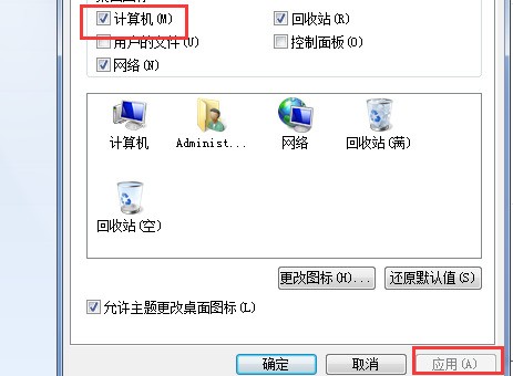 三、打开的窗口内勾选“计算机”,点击“应用”。