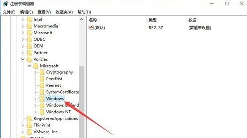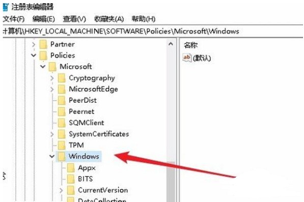 三、在注册表编辑器窗口中,找到“HKEY_LOCAL_MACHINESOFTWAREPoliciesMicrosoftWindows”注册表项。