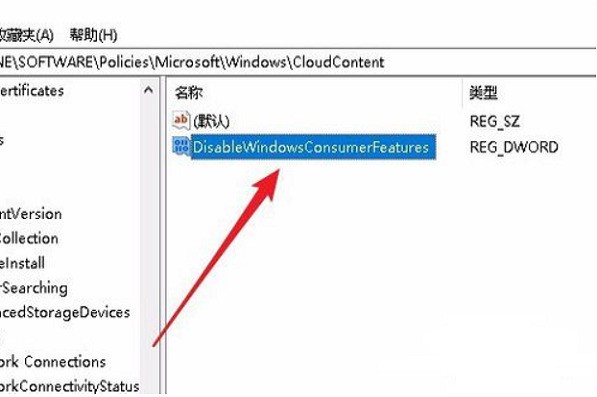 七、将新建的注册表键值重命名为“DisableWindowsConsumerFeatures”。