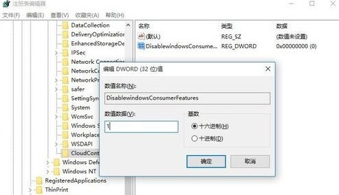 八、双击“DisableWindowsConsumerFeatures”注册表键值,在编辑窗口中,将数值数据修改为1,然后单击“确定”。这样就可以禁止win10自动安装软件了