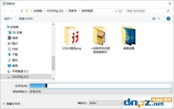 4.然后将保存类型更改为“所有文件(*.*)”,并将文件名命名为“remove.bat”。