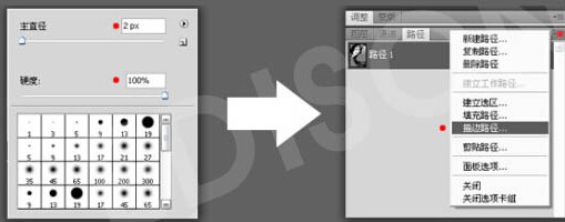 笔触为:主直径2px 硬度100%。接着来到路径面板,点击面板右上角的小三角形(扩展参数),选择描边路径。并且在弹出的对话框把“模拟压力”勾选上。