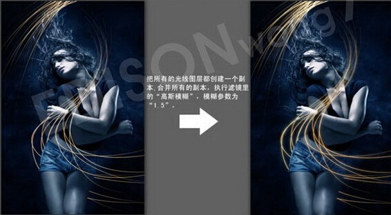 拷贝一层新的光线图层,新的图层去掉刚刚创建的图层蒙版,然后稍稍地错开一下两者的位置。然后将所有光线图层都创建一个副本,并且合并它们。在滤镜中选择“高斯模糊”,模糊参数为1.5。