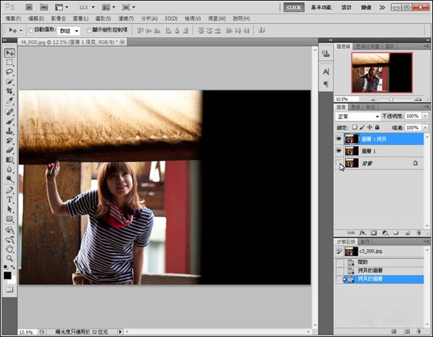 开启图片后,按下快速键Ctrl+J两次,复制两个背景图层【图层1】和【图层1拷贝】。接着单击一下【背景】图层旁的眼睛图示,暂时关闭背景图层。