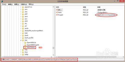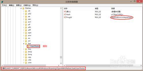 找到:HEKY_CURRENT_USERSoftwareMicrosoftWindowsCurrentVersionExplorerFileExts.batUserChoice,其中红圈部分是你选择的notepad.exe打开方式,删除文件夹UserChoice,注:是UserChoice整个文件夹。