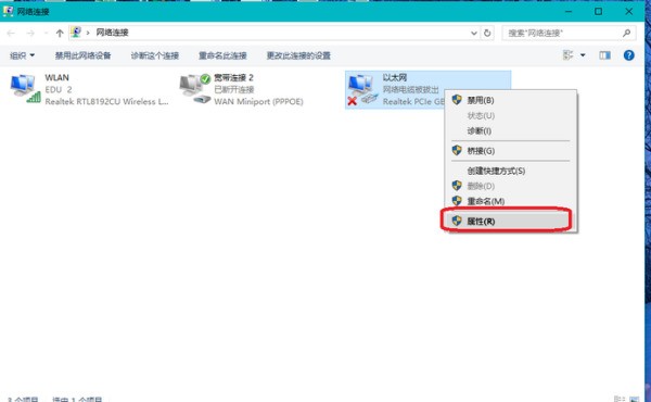 从打开的“网络和共享中心”界面中,点击左上角的“更改适合器设置”按钮进入,并在弹出的“网络连接”界面中,右击“未识别的网络”以太网图标,从其右击菜单中选择“属性”项。