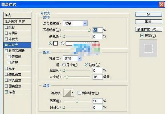 4、双击文字图层,在弹出的图层样式对话框中选择“内发光”和“描边”样式,设置参数如图所示,其中内发光的的颜色为乳白色,描绿组别玉印怀套稳顺边的颜色为白色。