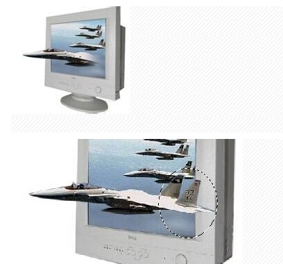 6.删除飞机尾部并柔化,使飞机和屏幕融合得更自然单击工具箱中的椭圆选框工具按钮,设置羽化为20,选取飞机尾部区域,如下左图所示。按Delete键后效果如下右图所示。