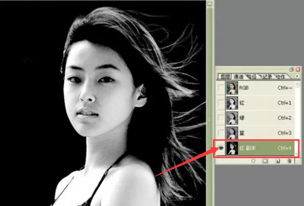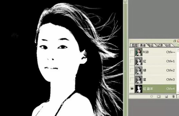 2、首先进入通道,因为红色通道对比最明显,所以复制红通道,用色阶的黑场吸管把背景变黑细节用加深减淡工具处理;