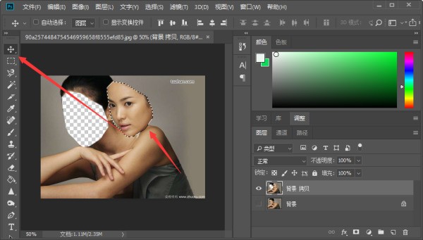 4、然后在左边工具栏中选择“移动”工具,在选区上按住鼠标左键移动就行了,如下图所示。盯帆