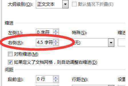 3、然后在打开的段落对话框中,发现右侧缩进被设置了字符数字。