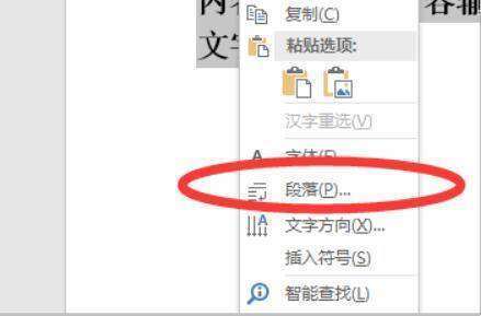 2、选中该段文字,点击鼠标右键,在弹出的选项中点击“段落”。