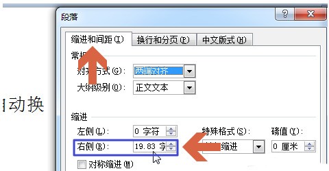 7、点击后,可以查看弹出界面的缩进和间距选项卡中的缩进项,设置当前文档的左右缩进。如图所示,右缩进的设定值较大。将值设置为适当并单击OK。