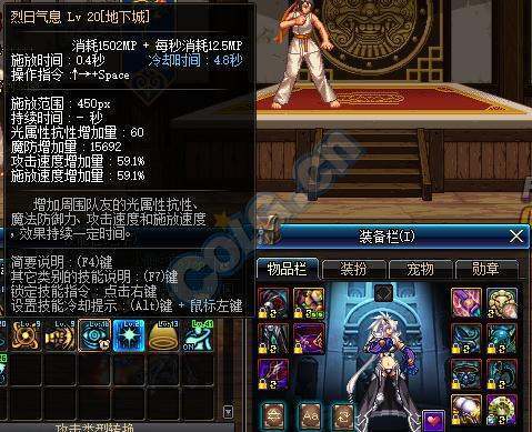 其次烈日气息的换装,满级+圣光3+异次元绿气色,武器用60SS手套,可以加2理环延级烈日气息和20%攻速,60%的释放和高达80%的攻速,对猫拳加成比较大。