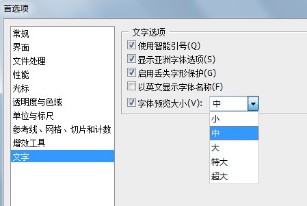 方法3:选择【编辑】-【首选项】-【文字】-【文字预览大小】,将选项选为更大号预设项。