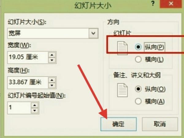 3、这个时候弹出新的对话框,需要确定幻灯片方向为纵向。