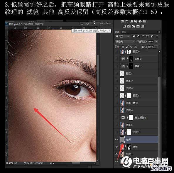 3、低该扩投巴念频修改好之后,把高频眼睛打开,高频上是要来修饰皮肤纹理的,滤镜 > 其它 > 高反差保留,参数大概在1- 5,确定后把混合模式改为“线性光”。