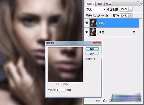 然后在新建的图层上执行【滤镜】|【模糊】|【高斯模糊】命令,打开高斯模糊对话框,设置半径为8。这个值可以根据自己的需要调节,数值越大,