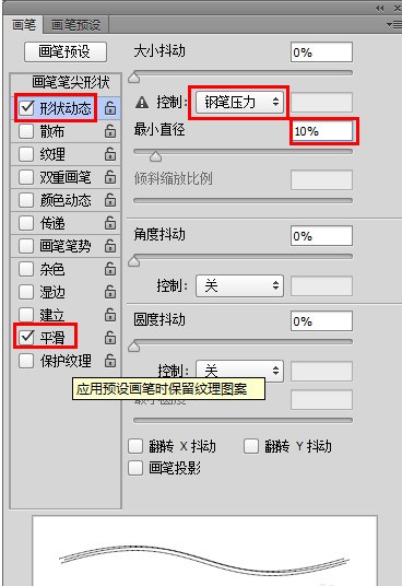 点击“形状动态”项,将“控内倍件花本使果制”设置为“钢笔压力”,将“最小直径”设置为“10%”。