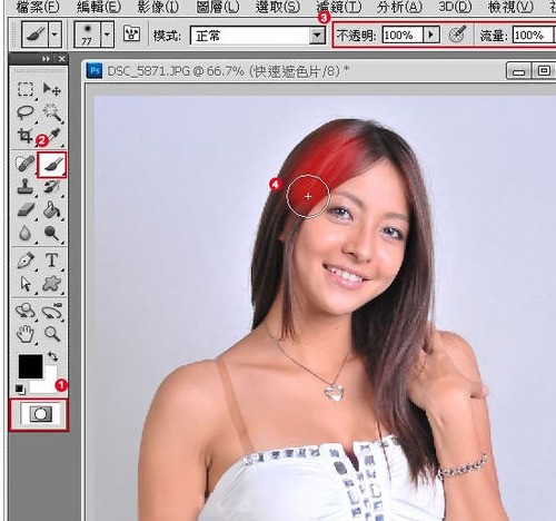 1、打开一张图片,并将模式切到快速蒙板,选择笔刷工具,并将不 透明与流量设为100%,来回涂抹要扣的人物。