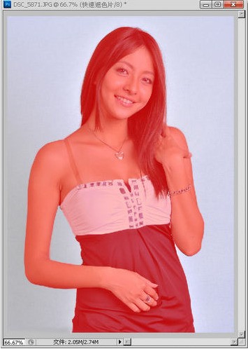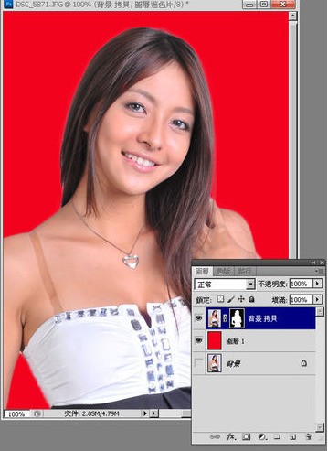 8、于下方新增一个图层并填入红色,再切回原来的图层,点选图层遮色片将一些细微 没去好的部分再作修整。